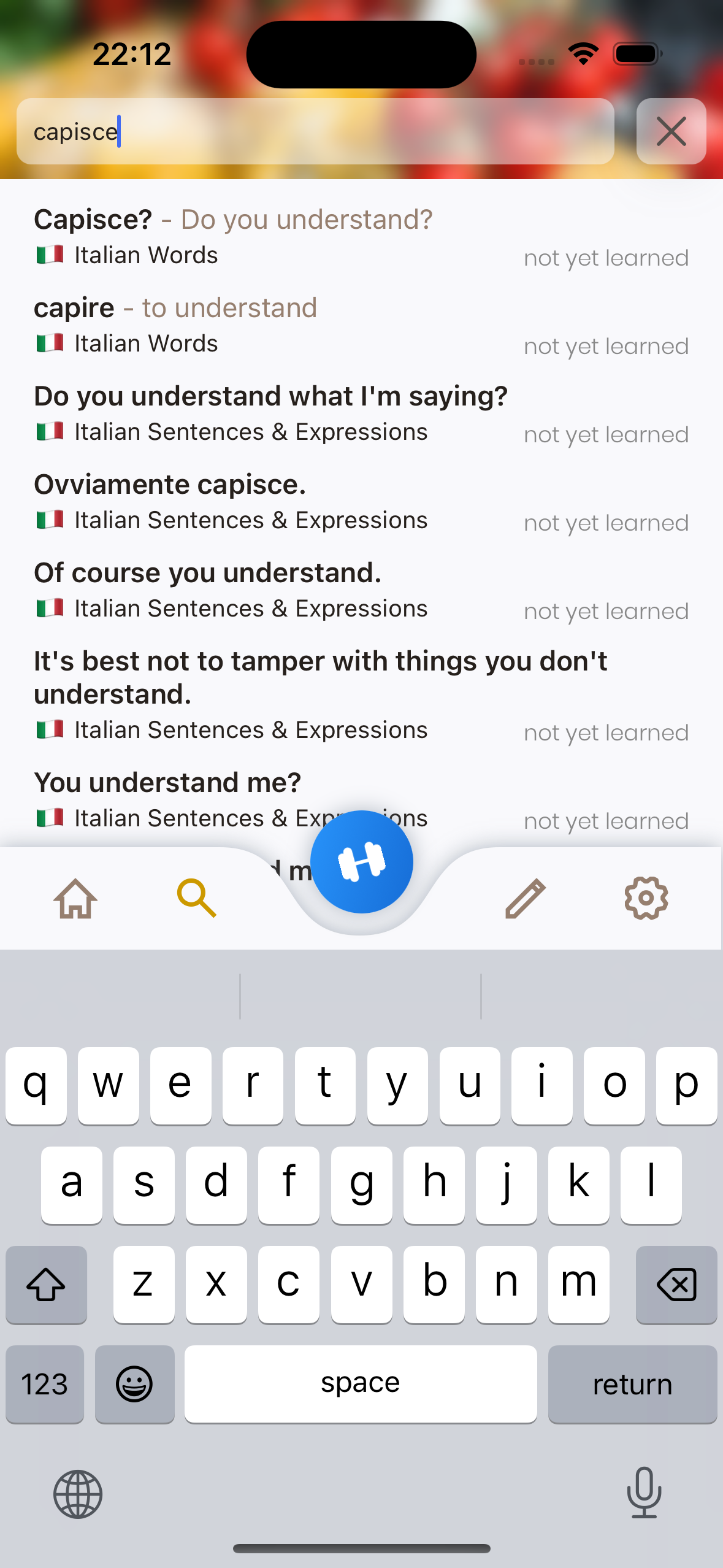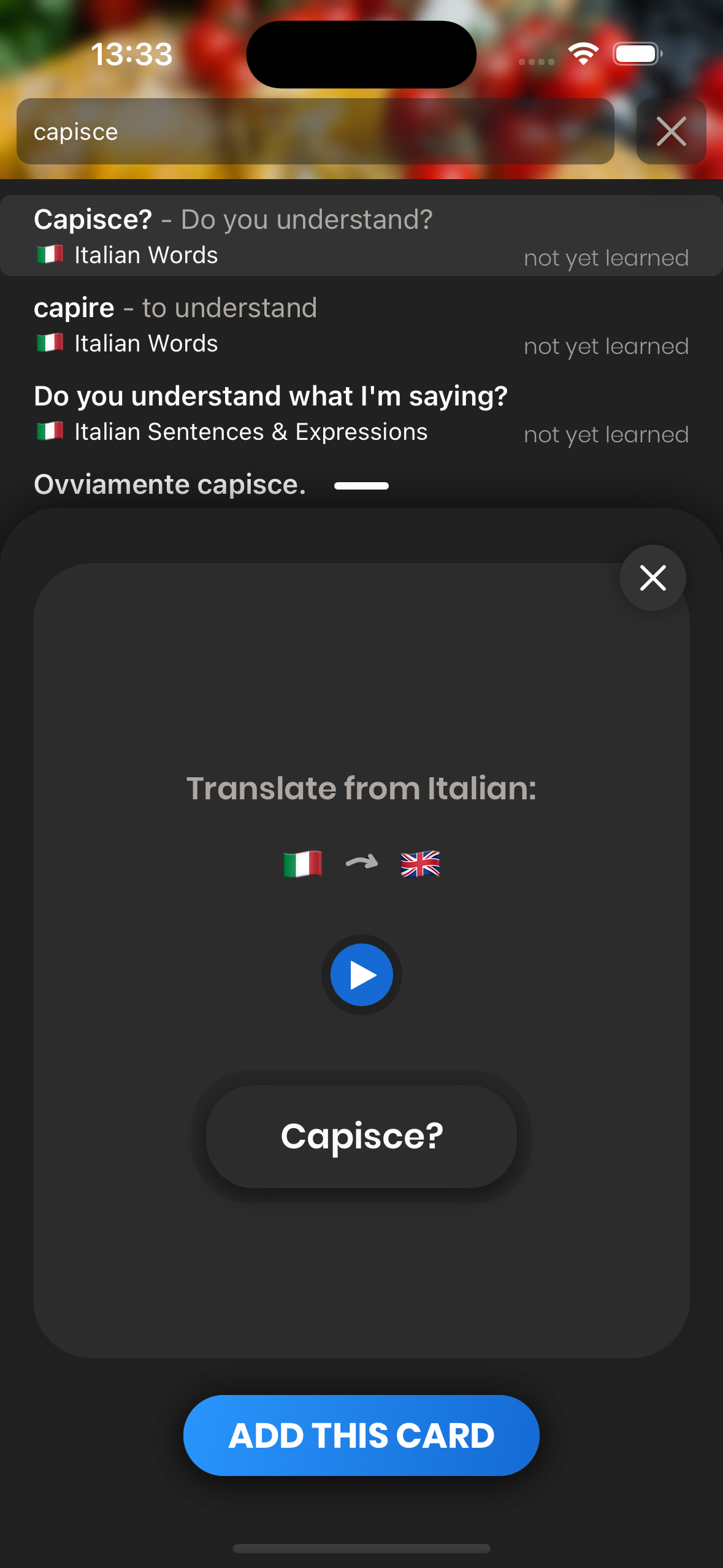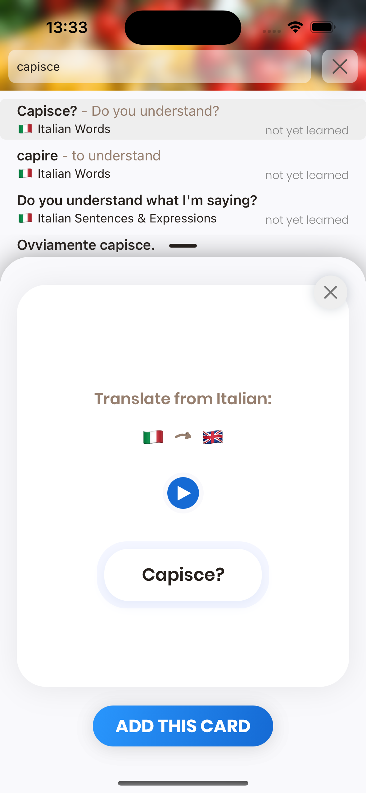 Look up a word you don't know, and add it immediately to your learning queue. Just Italian will make sure you will never forget the word.Dare to order something else than pizza!