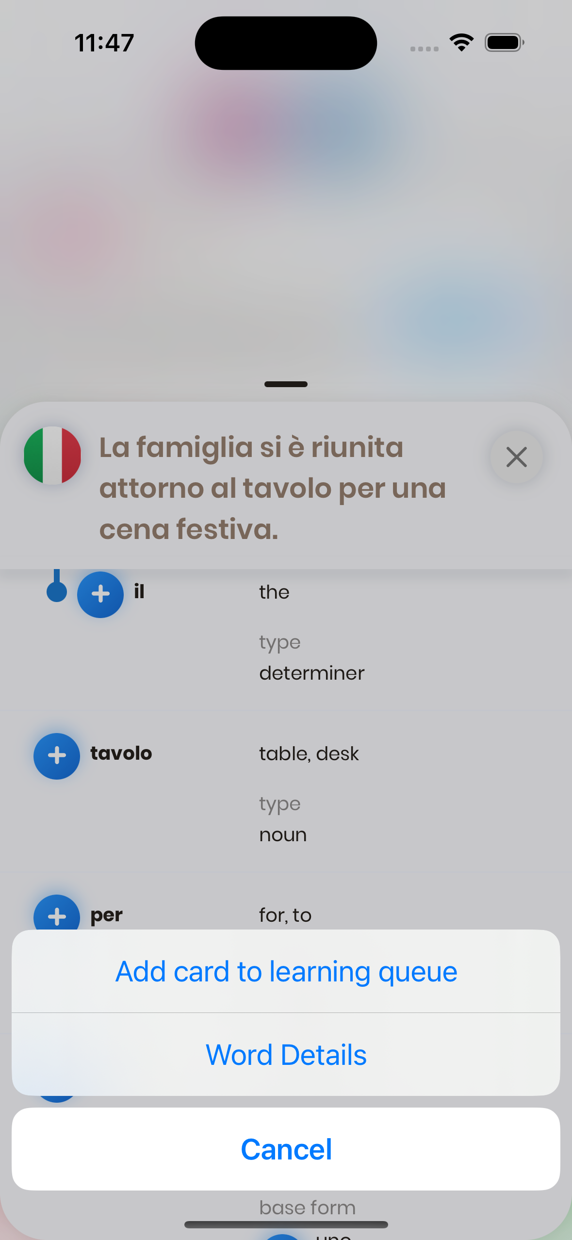 There, press a (+) button beside a word to add it to your learning queue.