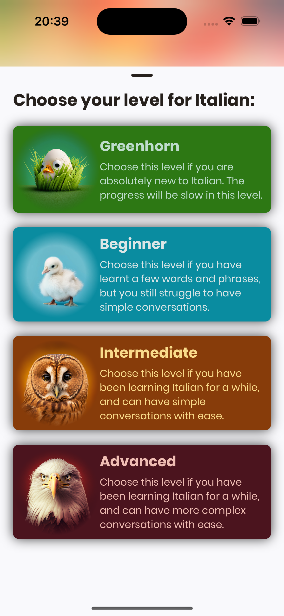 In the tutorial you do at the first startup of the app, Just Italian estimates your language ability and proposes a level for you. We recommend you to accept this level, but you can change it at any time.