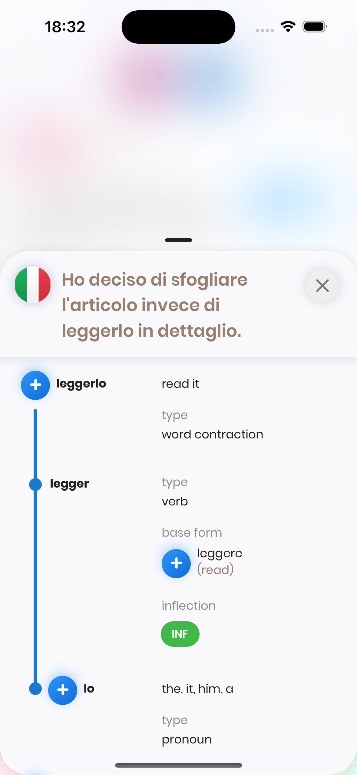 The Sentence Structure Modal will be shown if you press the (i) button on a sentence card, next to an Italian sentence.