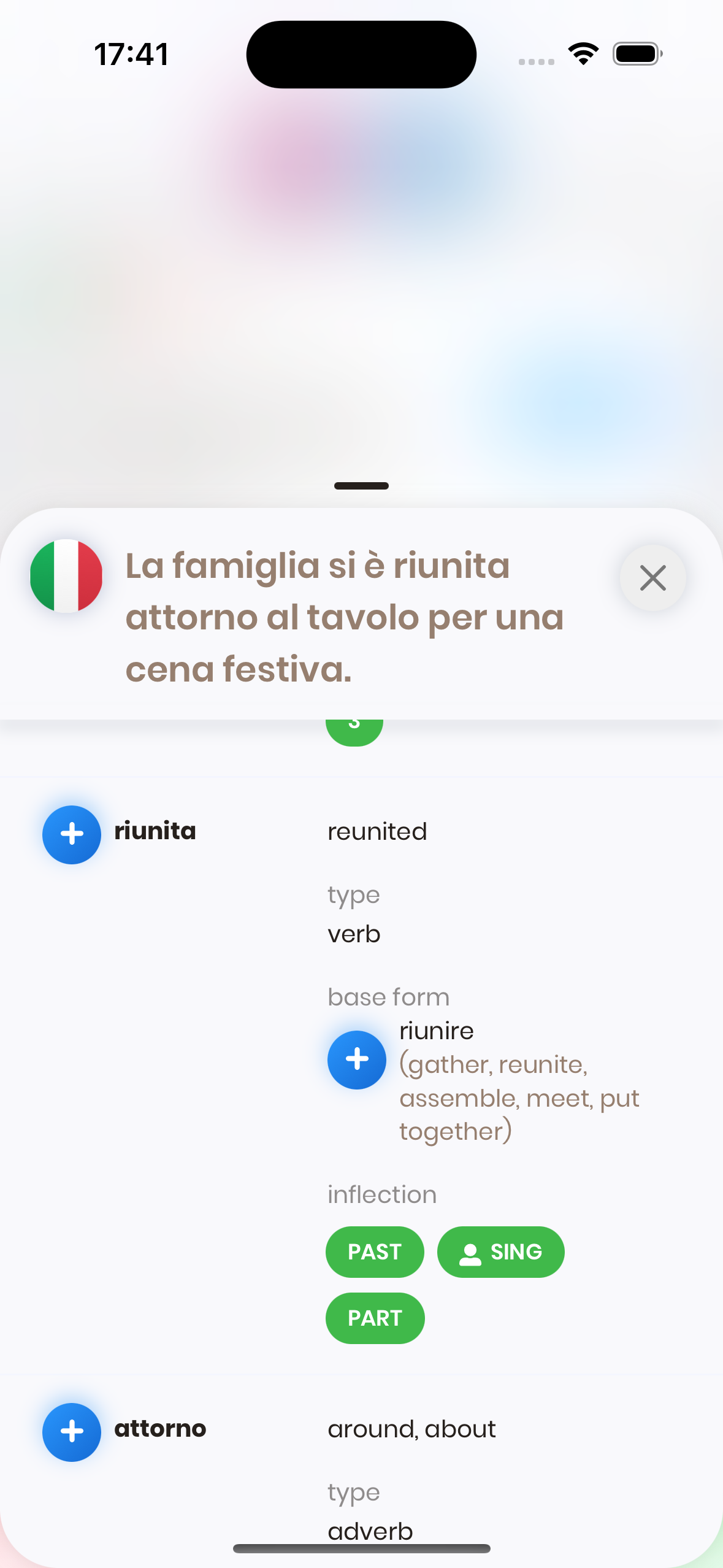 - Inflection Type: For inflected words, we also show the type of the inflection. In this case, "riunita" is the past participle of the word "riunire".