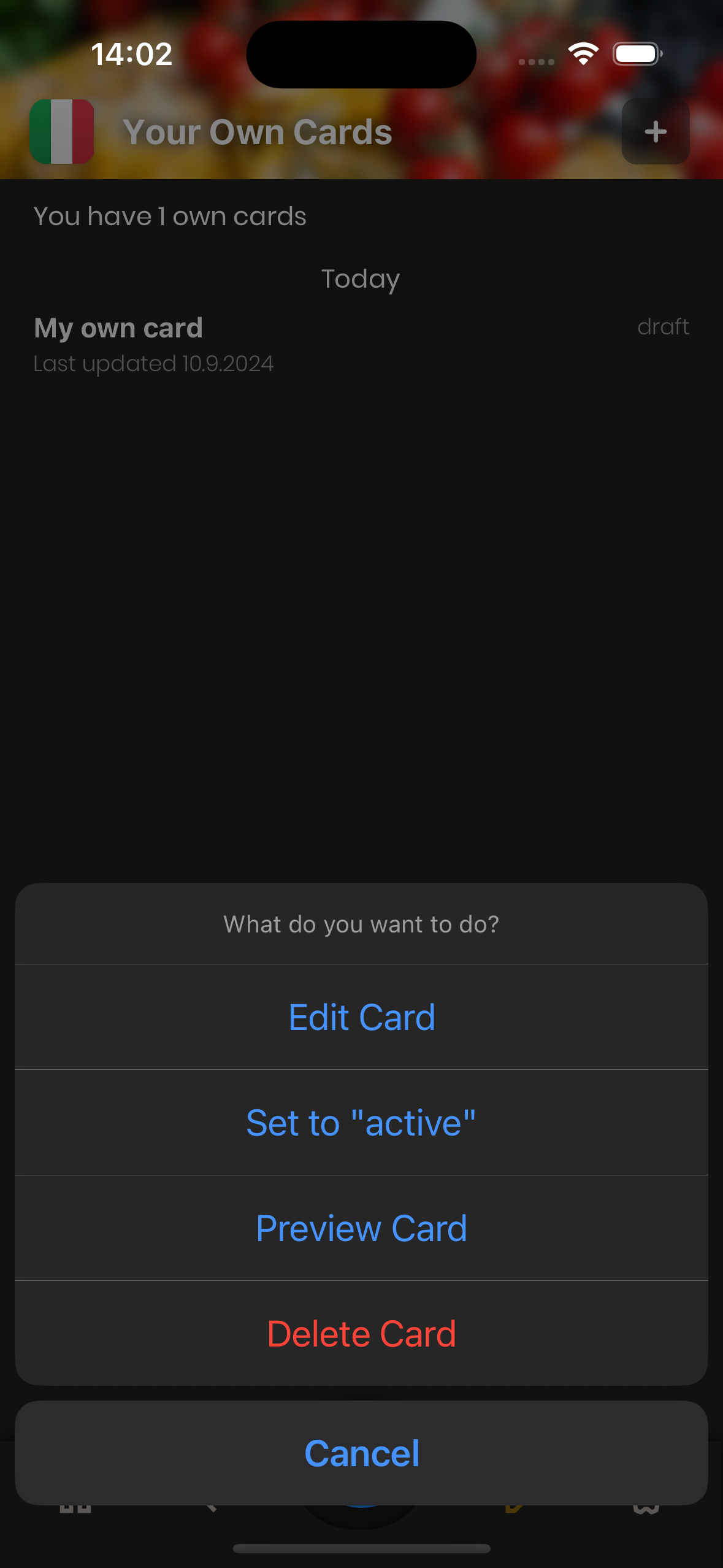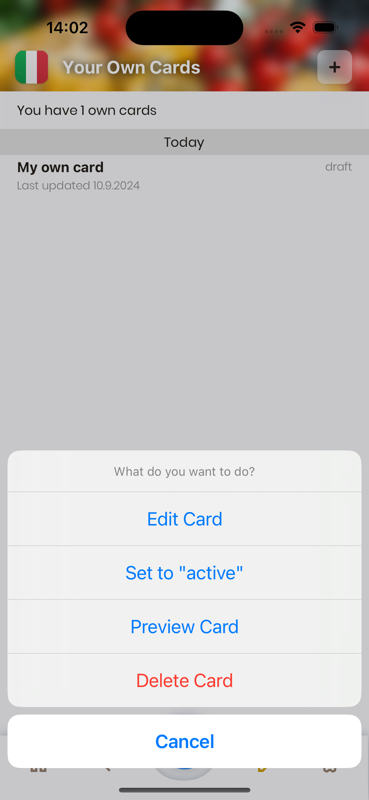- Card Status: An Own Card is either in "draft" mode or "active". Draft cards are not shown while learning. To change the status of a card, tap it.