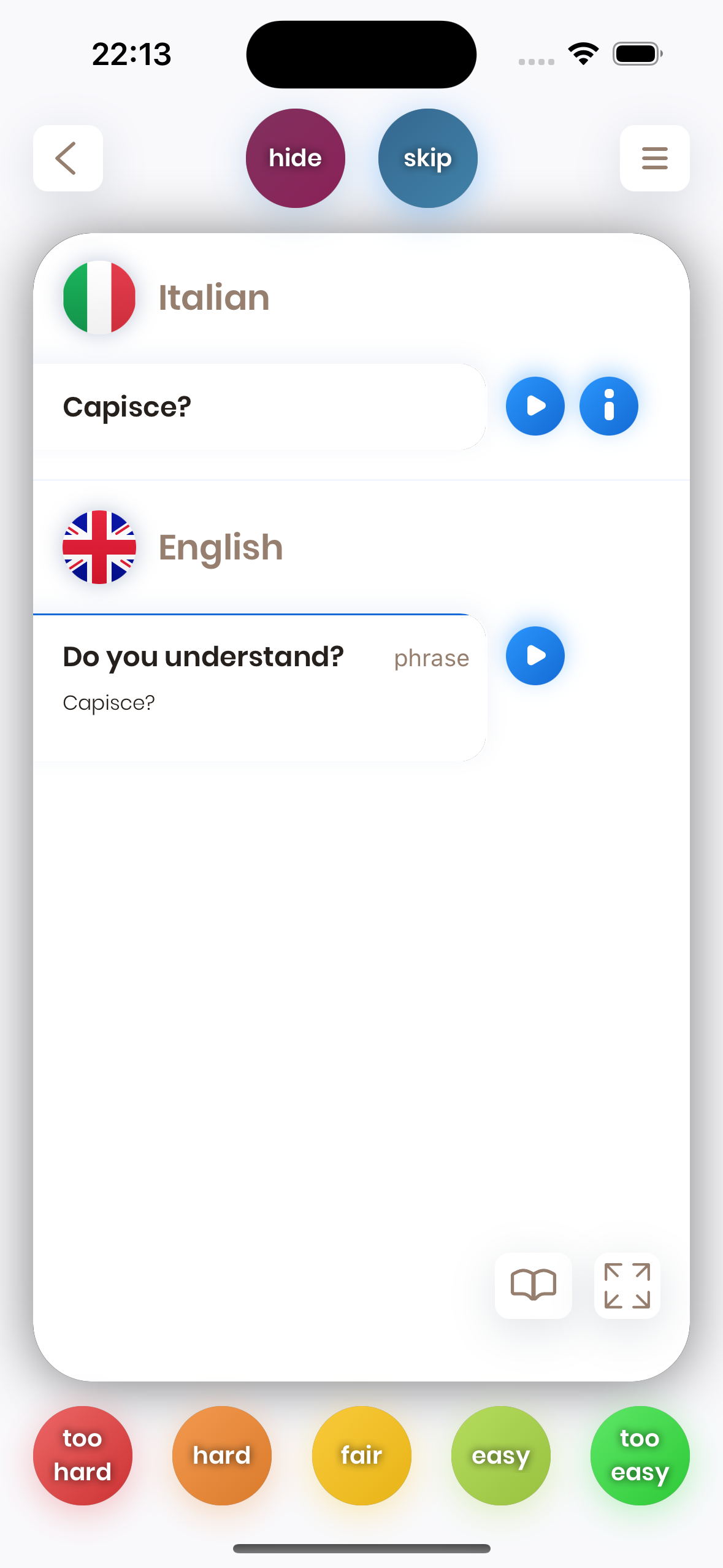 Just Italian is a flashcards-based app. Flashcards are cards which have both a front and a back side. You look at the front side and try to translate the word (or phrase) on it.