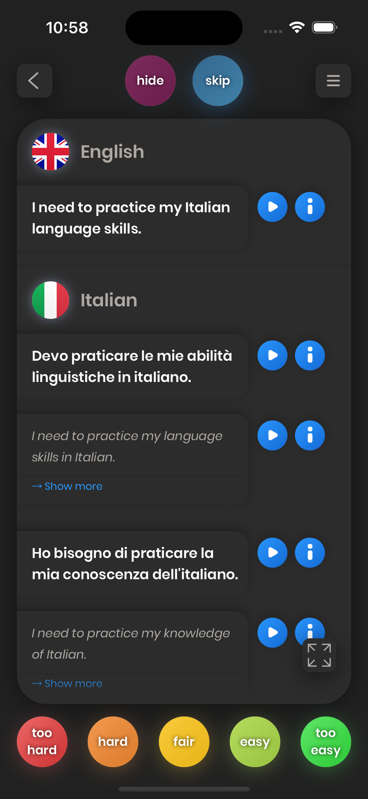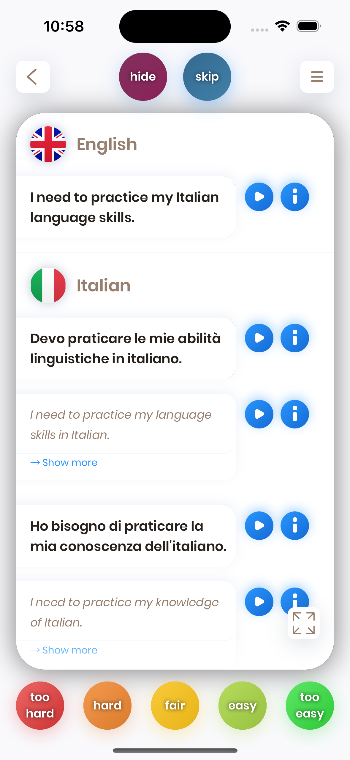 Look at a card. Try to translate the word or phrase. Turn the card. Tell the app how difficult it was.