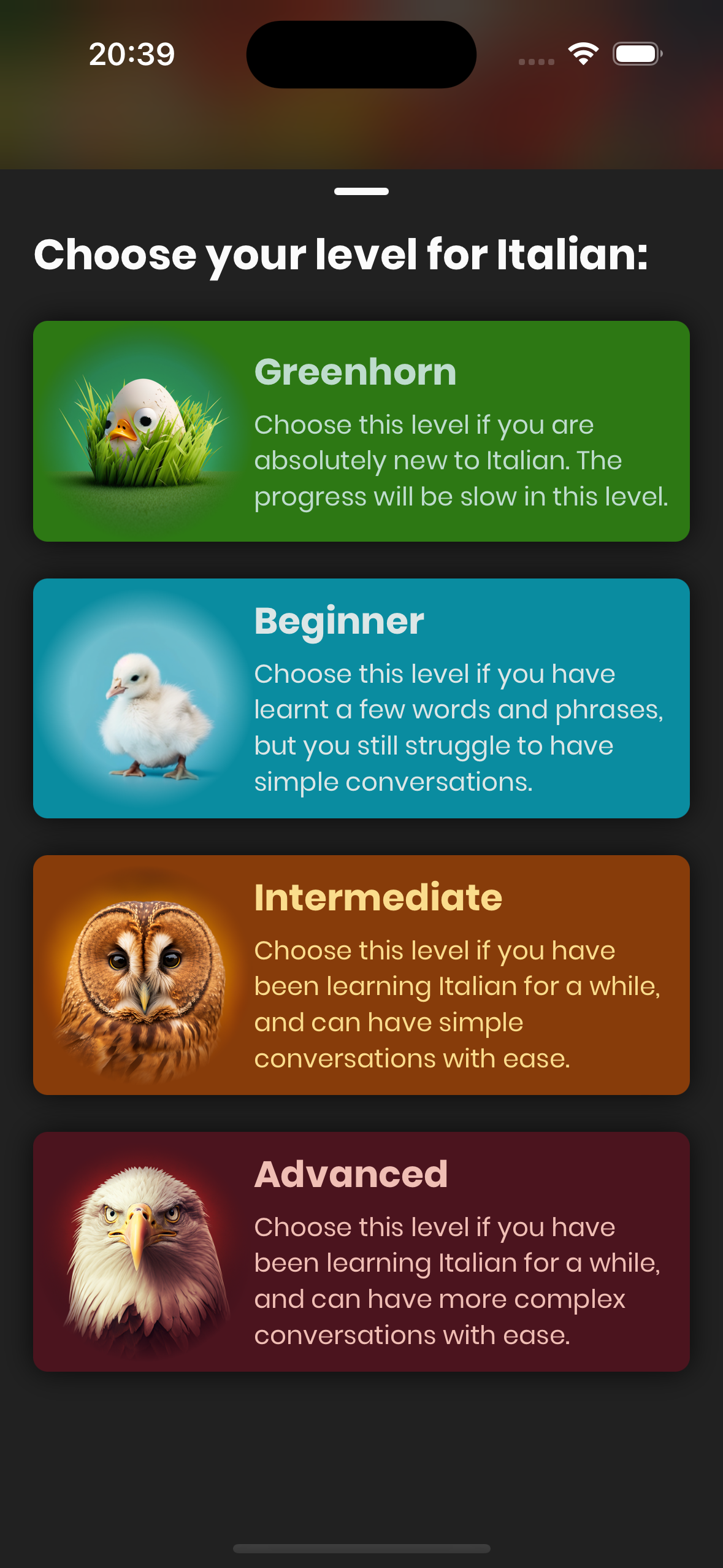 In the tutorial you do at the first startup of the app, Just Italian estimates your language ability and proposes a level for you. We recommend you to accept this level, but you can change it at any time.