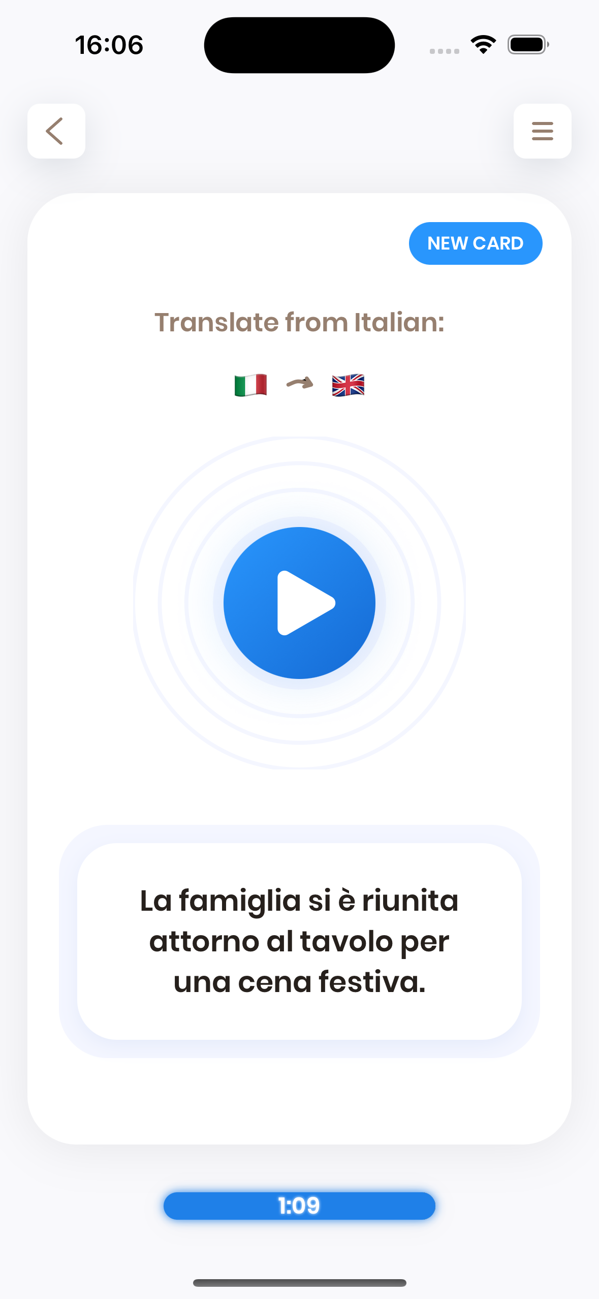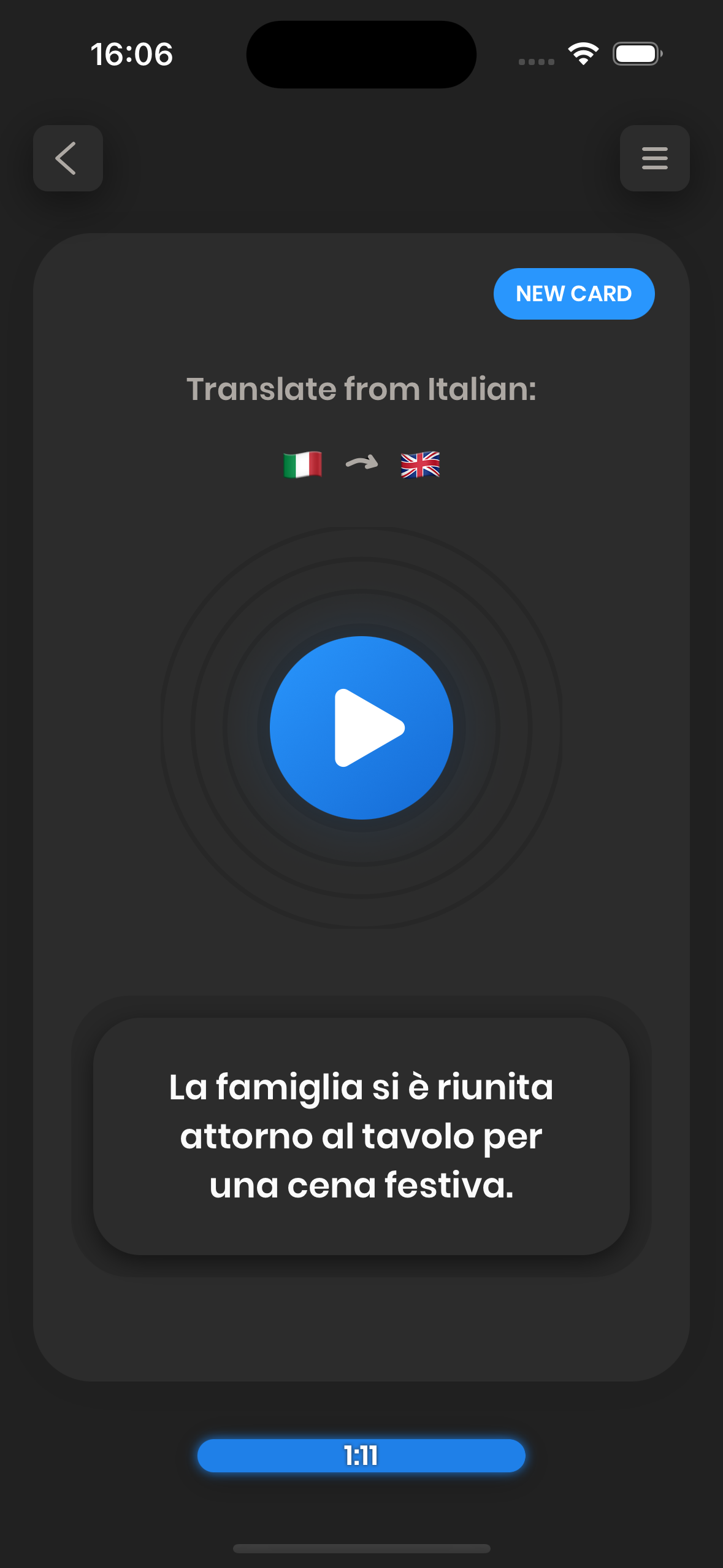 - The card invites you to translate a word or a phrase. You try to do that.