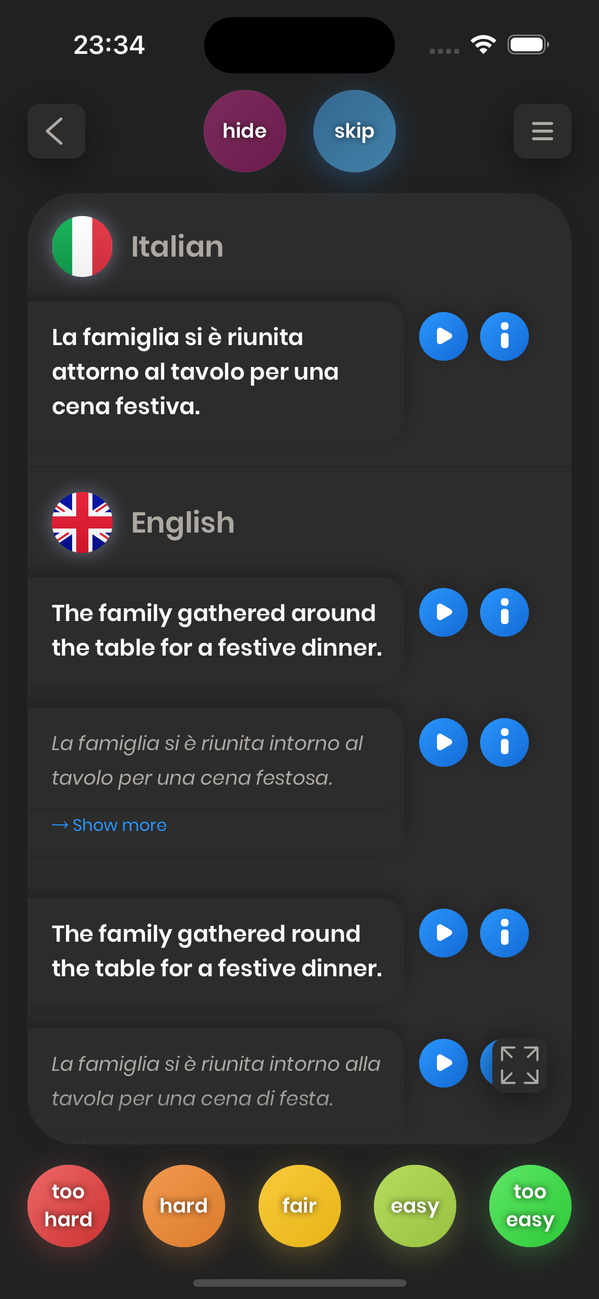 - Show Example Button: With this button, you can display the example sentence that illustrates the current translation.