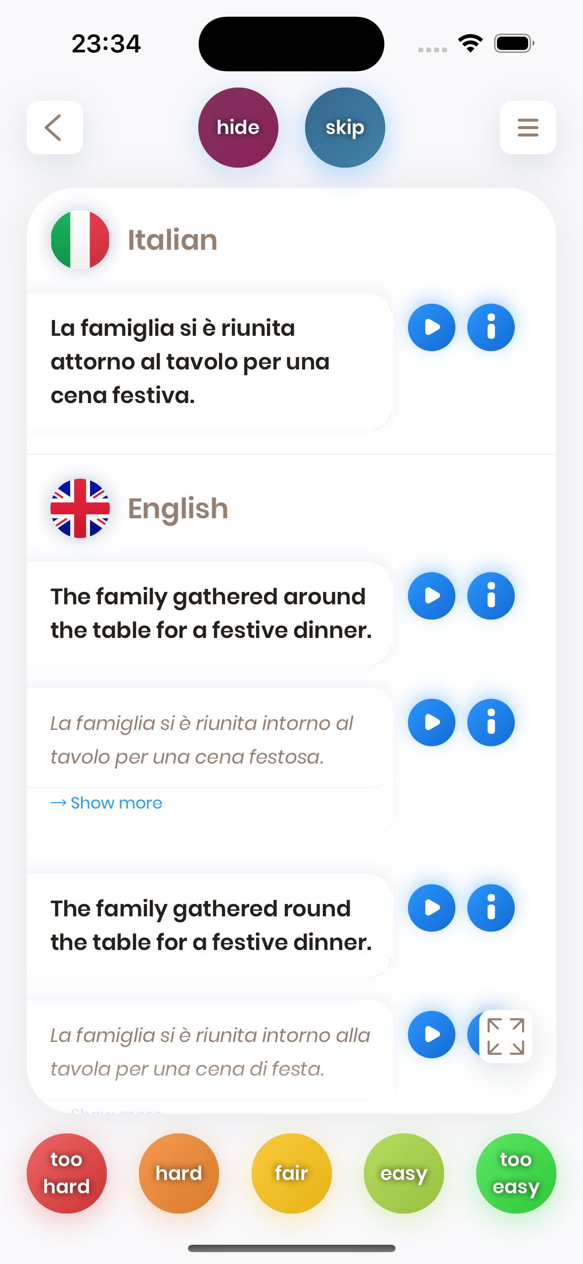 The Learning Screen is where you spend most of your time in Just Italian. Here, all content you learn is presented to you as cards.