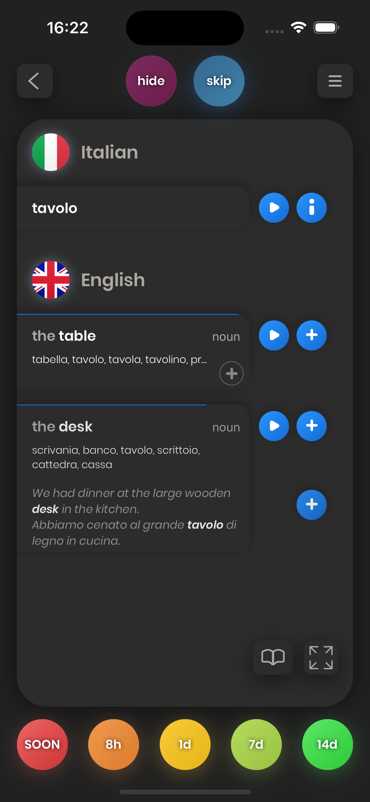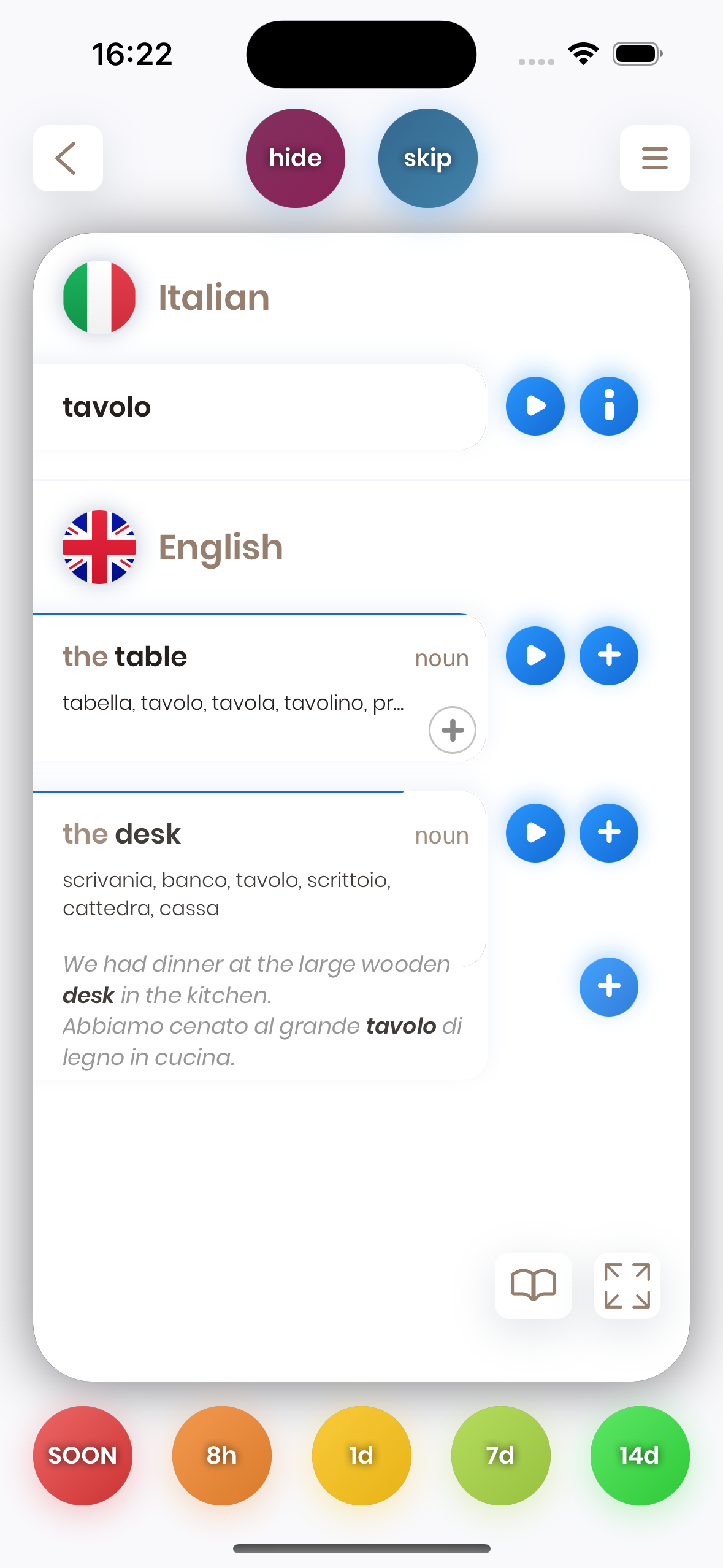 - Add Card Button: If you want to add the specific card of a word, you can press the (+) button. In this case, it will add the card which has "the table" on its front side.