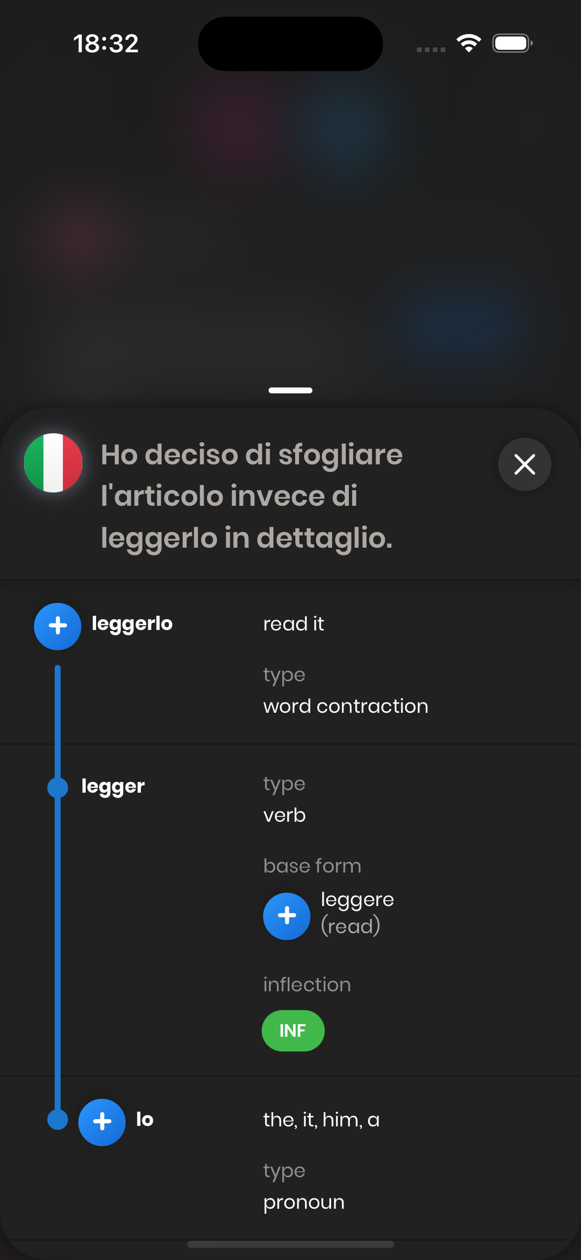 The Sentence Structure Modal will be shown if you press the (i) button on a sentence card, next to an Italian sentence.