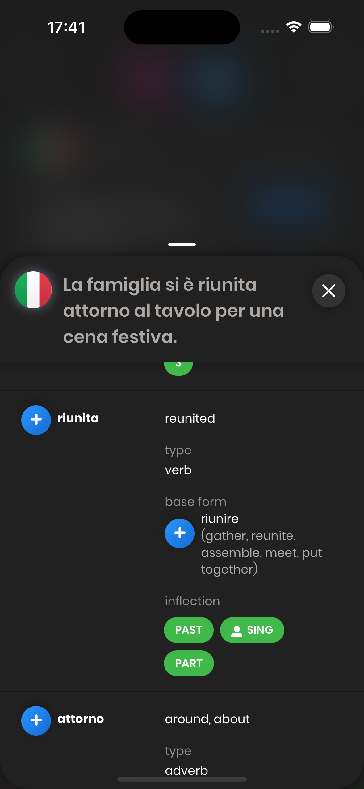 - Inflection Type: For inflected words, we also show the type of the inflection. In this case, "riunita" is the past participle of the word "riunire".