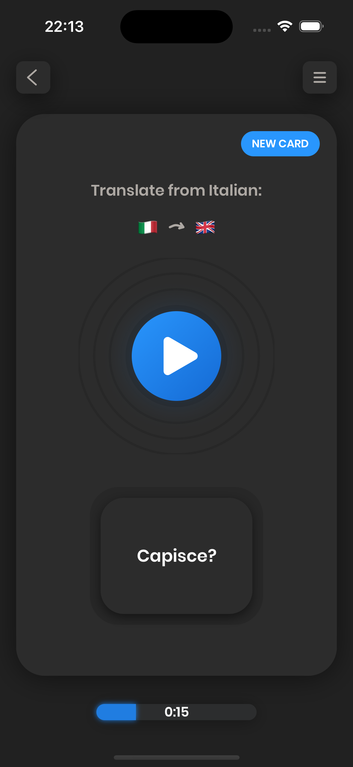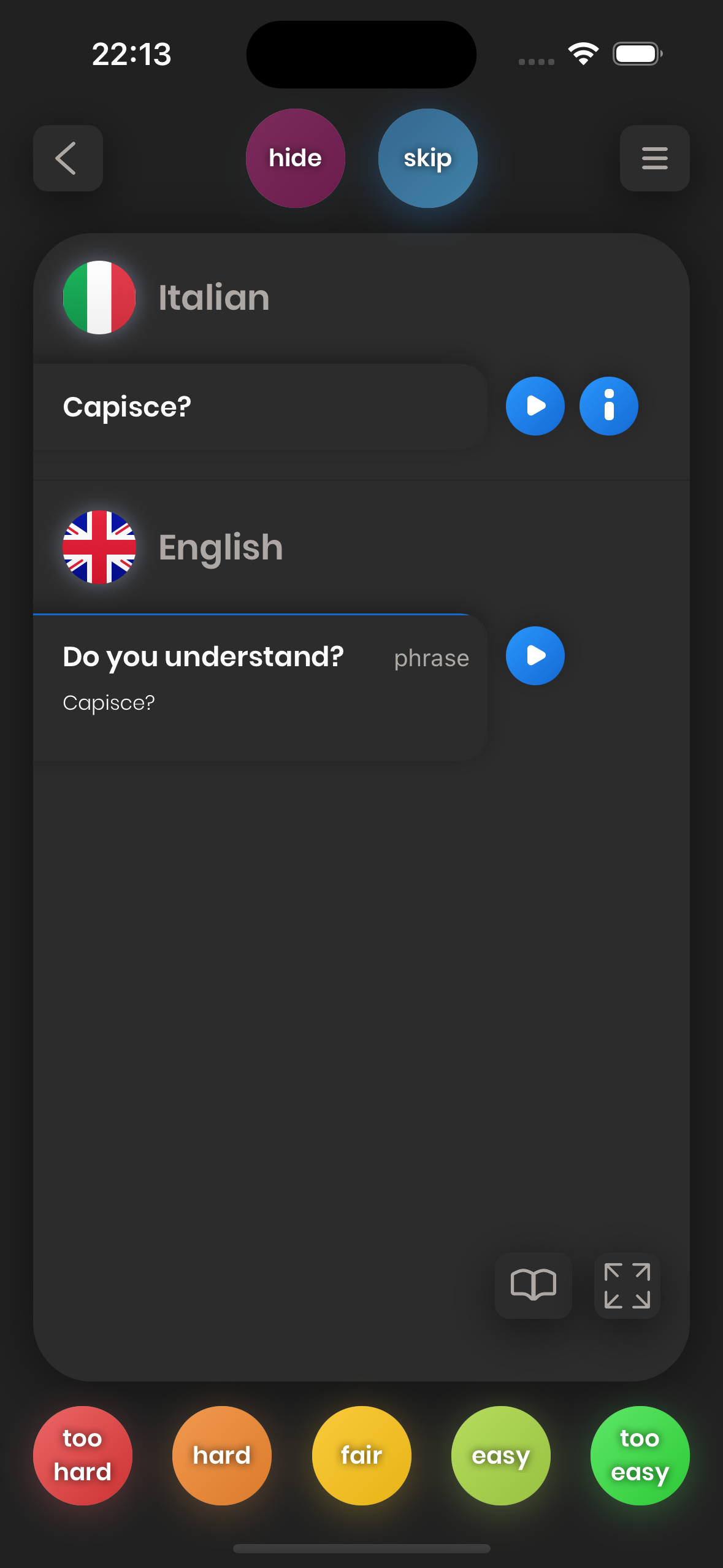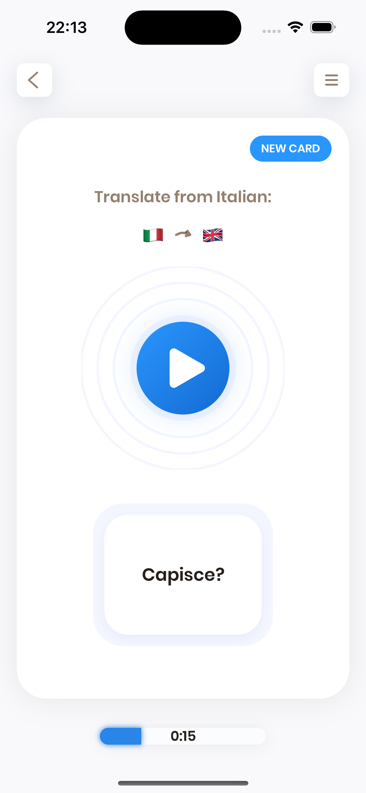 Just Italian is a flashcards-based app. Flashcards are cards which have both a front and a back side. You look at the front side and try to translate the word (or phrase) on it.